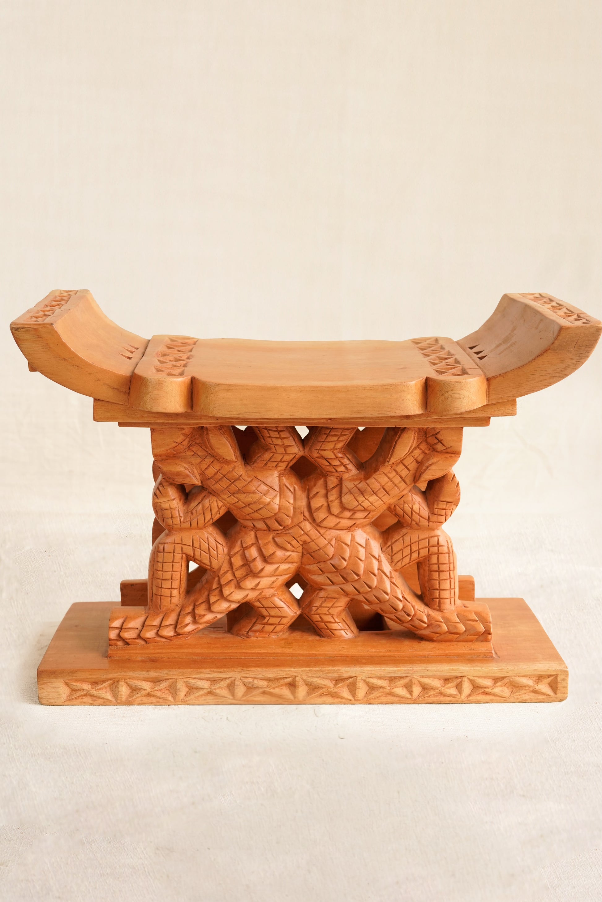 The captivating design at the heart of this stool is the Adinkra symbol Funtunfunefu Denkyemfunefu, which literally translates to "conjoined crocodiles". This profound symbol depicts two Siamese crocodiles sharing one stomach but fighting over food. The proverb associated with this image teaches a powerful lesson: despite our differences and the temptation toward conflict, we share a common destiny and are ultimately interdependent.